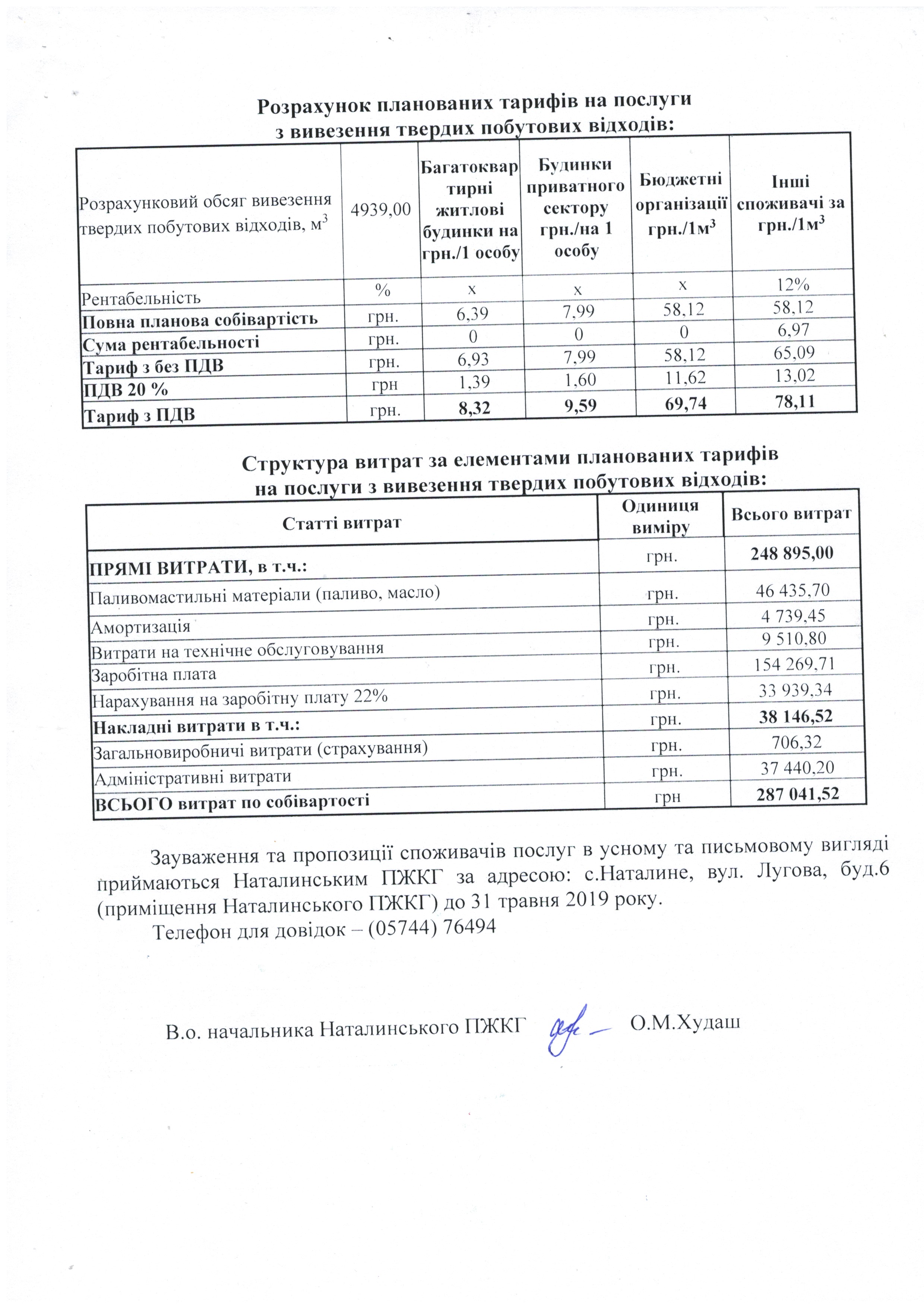 Про зміну тарифів на послуги з вивезення твердих побутових відходів Наталинського підприємства житлово-комунального господарства